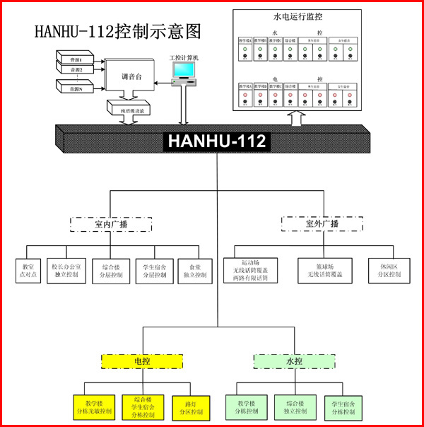 为了控制方便,便于对其它子系统(如监控系统,校园电视系统等)的兼容控制,建议控制中心设在学校的相对中心位置(地理位置)。所有控制信号从此发出,所有回馈信号都集中到这里,总控机房是整个管理系统的神经中枢。水电控制块除了和广播块一样,在电脑显示器上有运行状况显示外,还专门在总控制室设有水电运行监控屏,水电运行状况一幕了然。电控块的运行信号由现场反馈,避免失误;水控块的手动/自动转换开关设在水电运行监控屏上。